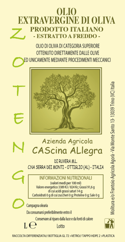 The business rationale of Cascina Allegra Estate is still the same: quality first. About the olive oil the absence of consolidated local experiences on the one hand, and the particular climate and weather conditions on the other, have imposed for tuning the manufacturing process a long lasting experimental and adapting phase. Initially confined to its own use only, given the reduced production quantity available, the commercial production began in 2015, the year of the birth of Zotengo the Cascina Allegra’s extra-virgin olive oil.
