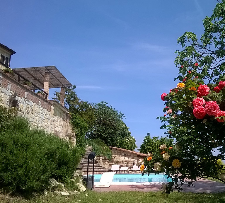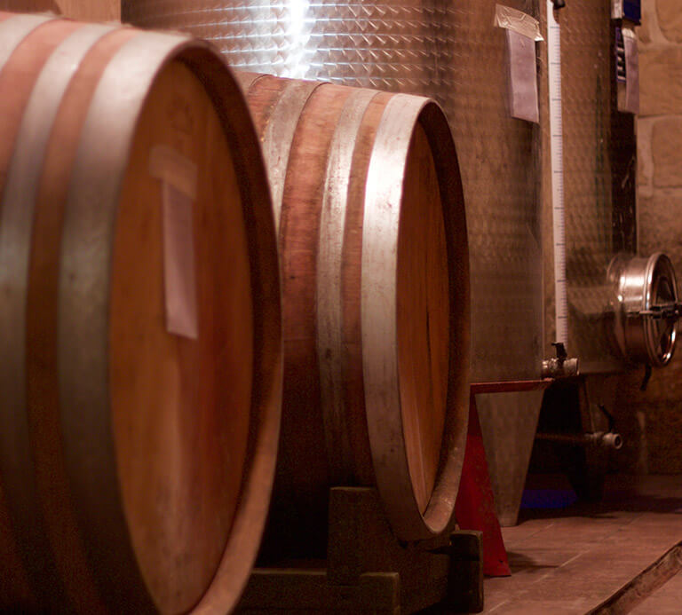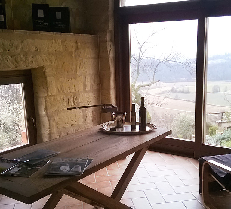 Il recupero conservativo degli annessi rurali ha consentito la realizzazione nell’ex fienile di un locale adibito ad ufficio e punto di ricevimento e degustazione, caratterizzato da una ampia vetrata che offre una vista impareggiabile sulla tenuta con il profilo delle colline sullo sfondo.